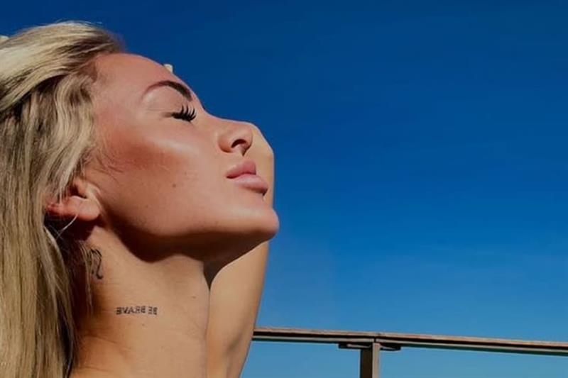 Имено, таа објави фотографии на кои позир гола до половината, облечена само во фармерки, додека градите ги покрива со рацете.