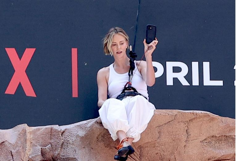 Шарлиз Терон, опремена со безбедносна опрема, се искачи на вештачка карпа поставена покрај голем рекламен билборд, а кога стигна до врвот, ѝ мавна на толпата и предизвика воодушевување кај публиката што се собра долу. Сепак, иако сцената изгледаше како спонтан адреналински потфат, наскоро стана јасно дека зад сето тоа стои филмска промоција.