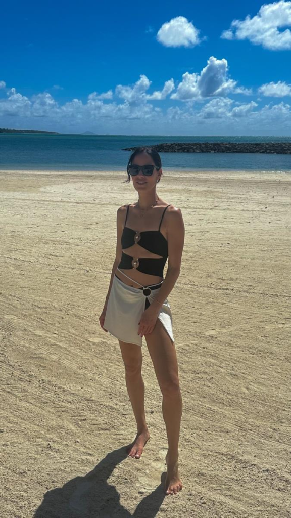 Две прерамки и мини здолниште, односно елегантно црно бикини и кратко бело парео, ја фрлија прекрасната песочна плажа, тропските палми и тиркизната боја на морето целосно во втор план.