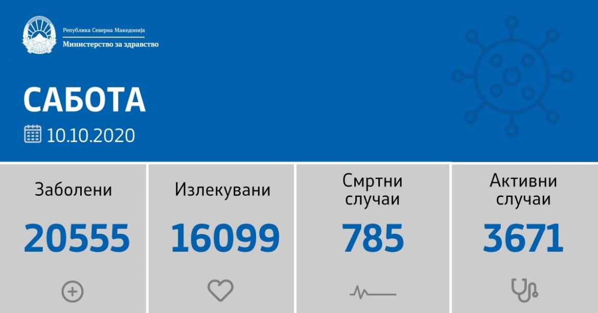 Вкупната бројка на ковид дијагностицирани во нашата земја од почетокот на епидемијата изнесува 20555, бројката на оздравени пациенти е 16099, на починати е 785, а во моментов бројот на активни случаи во земјата изнесува 3671.