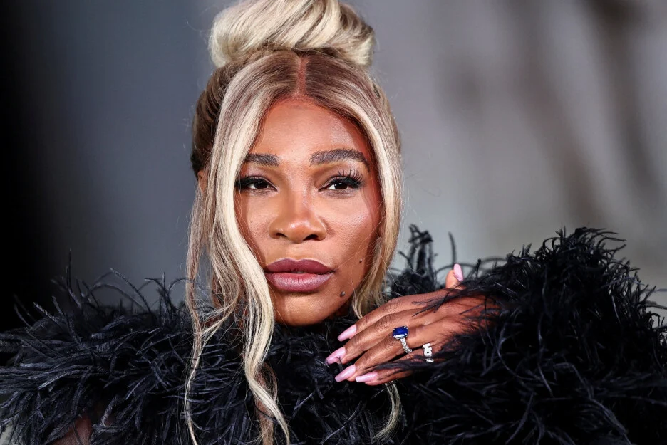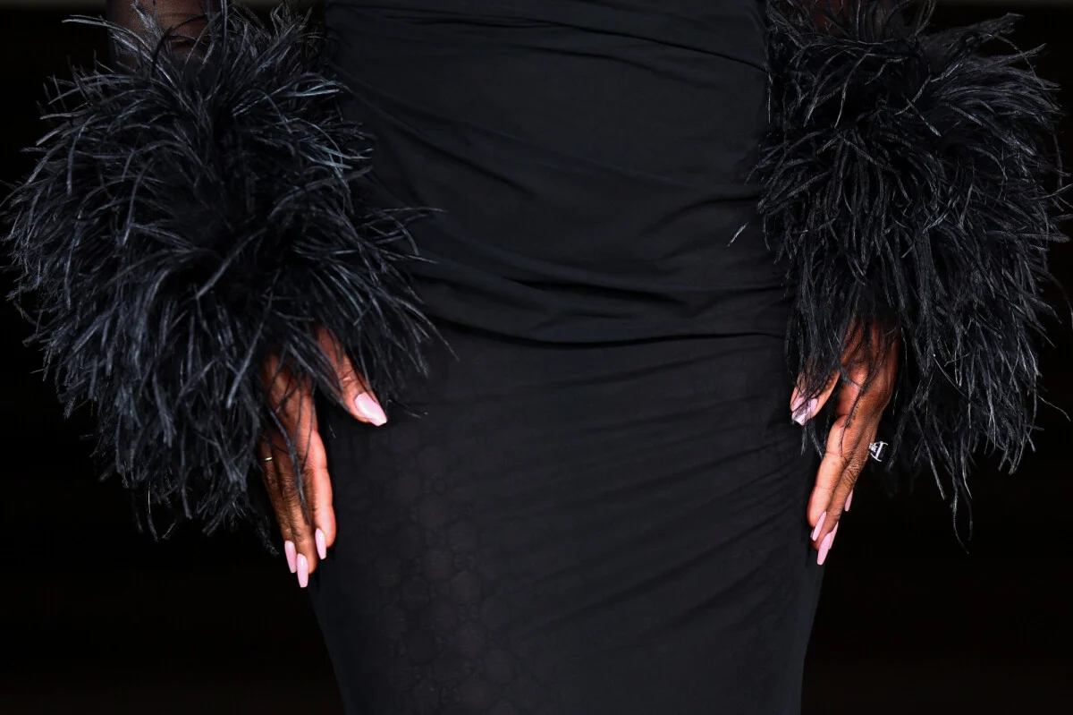 23-кратната освојувачка на Гренд слем титули привлече внимание во полупроѕирна црна тоалета со детали од перја на ракавите, околу вратот и на долниот дел, кои го направиле целото издание подраматично.