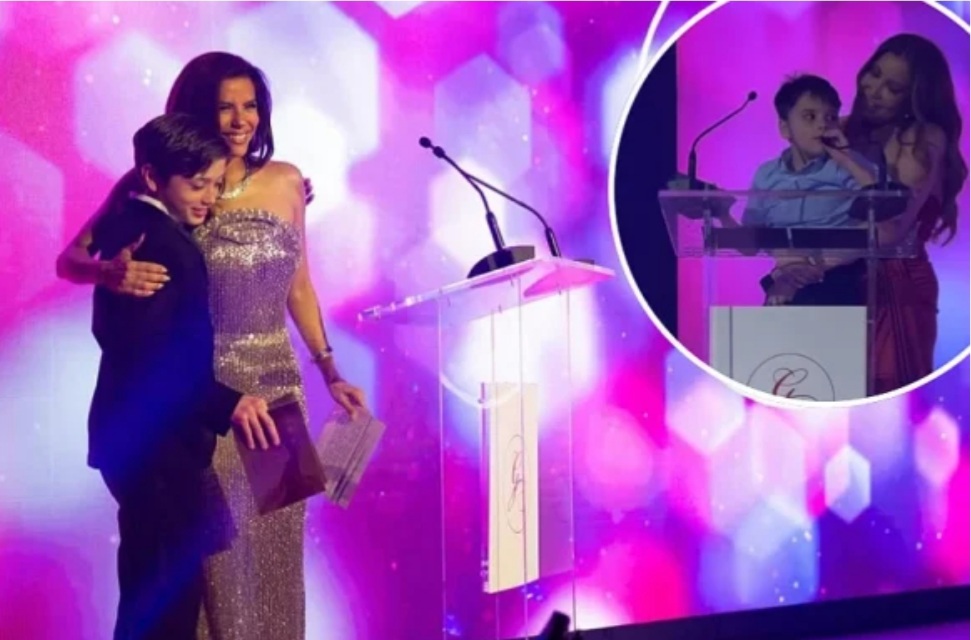 Ева Лонгорија во саботата присуствуваше на Глобалната гала за подароци во хотелот „Претседател Вилсон“ во Женева, а додека се фотографираше, нејзиниот син Сантијаго го украде вниманието. Актерката од „Очајни домаќинки“ ја воодушеви публиката додека чекореше по тепихот во светкав сребрен фустан покриен со светки и испреплетени ремени на деколтето. Почесната гостинка на настанот, 50-годишната Лонгорија, изгледот го заокружи со сребрено ланче и обетки.