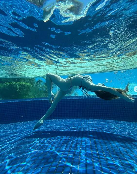Убавата Синди е снимена како сензуално танцува во базен, во минијатурно бикини, кое ги исткна нејзиното совршено тело.